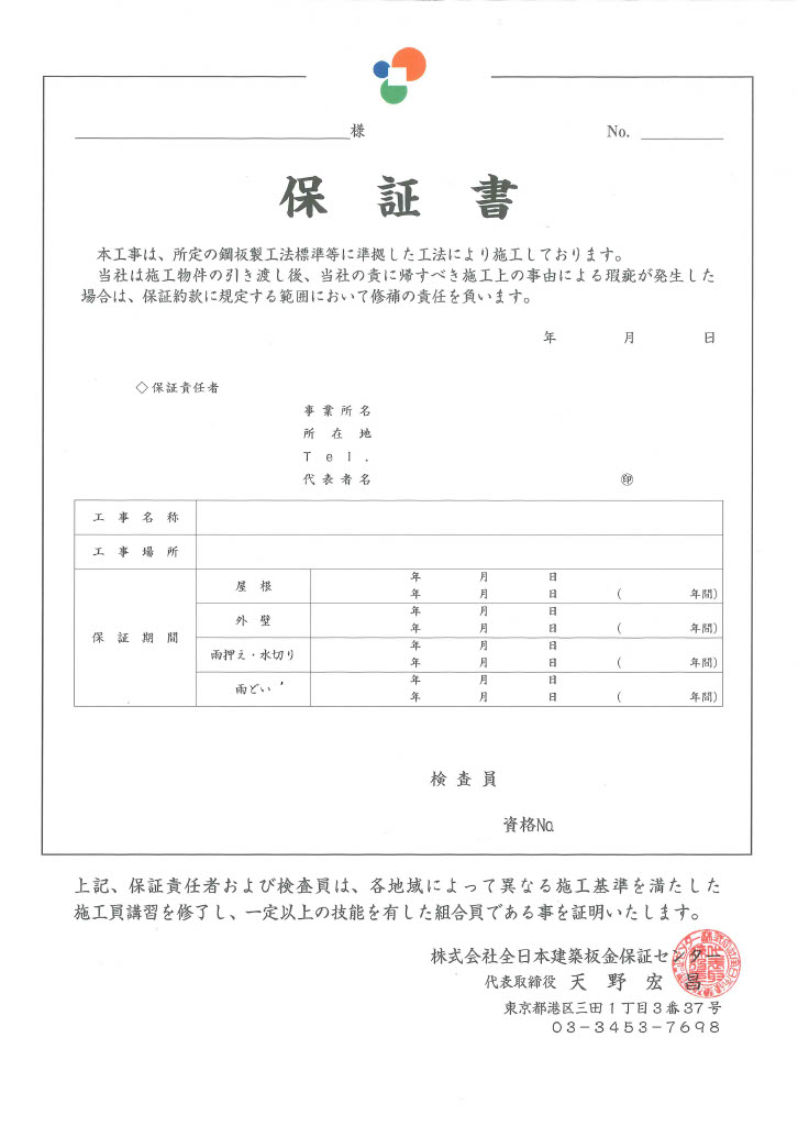 | ○ 宮城県板金工業組合員が高度な技術をもって確かな施工を致します。 ○ 宮城県板金工業組合「有資格者」の組合員が10年間の保証書を発行致します。 |